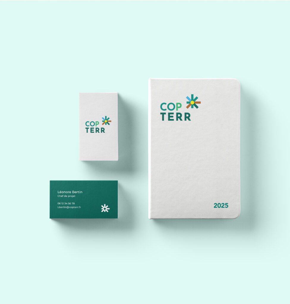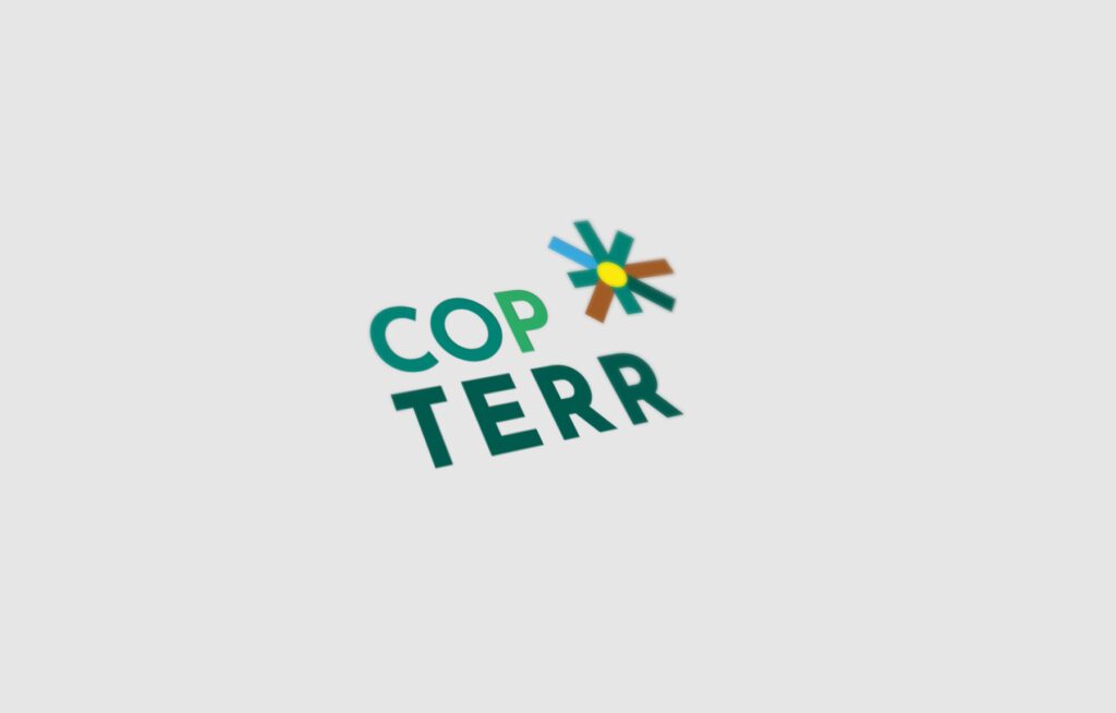 Une typographie sobre et impactante avec Le nom COP TERR affiché en majuscules, dans une police contemporaine et accessible, affirmant la solidité du projet tout en restant lisible pour tous les publics.
